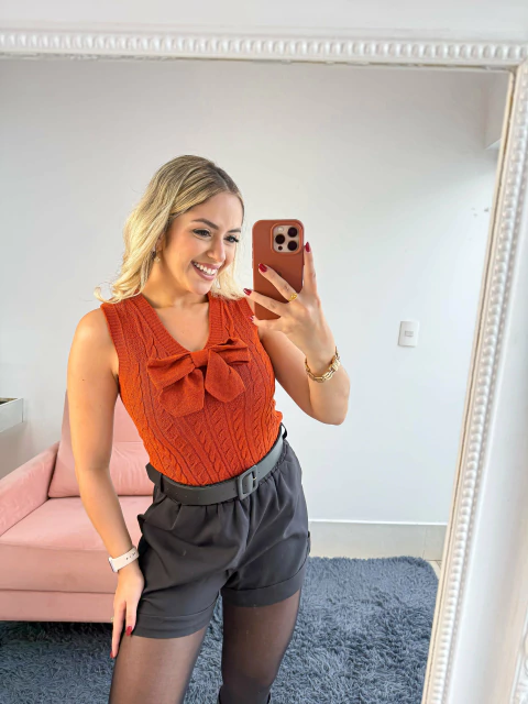 Com um design que une charme e personalidade, a blusa de tricô cavada com laço na frente na cor terracota é puro desejo em forma de roupa. A modelagem cavada valoriza os ombros com delicadeza e ousadia, enquanto o laço frontal traz um toque romântico e sensual na medida certa.